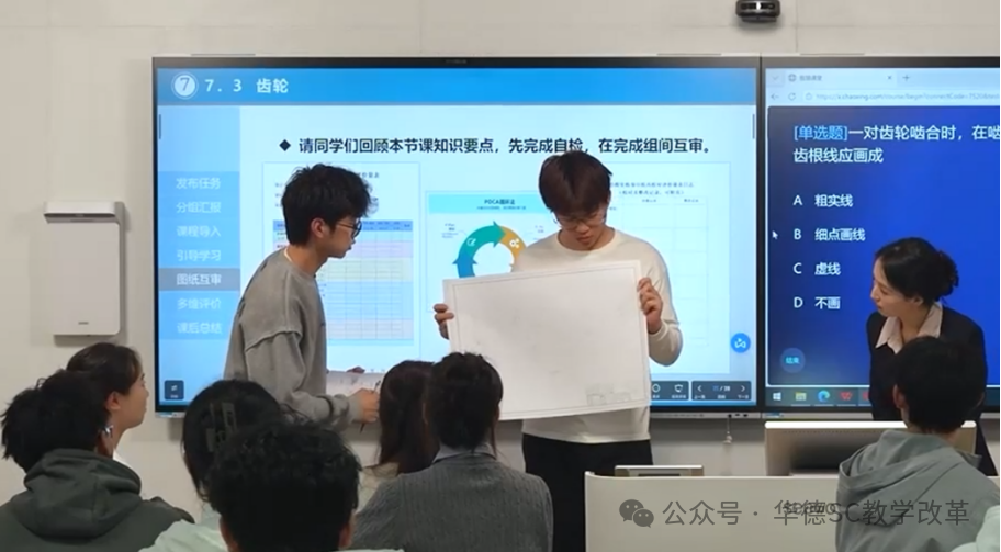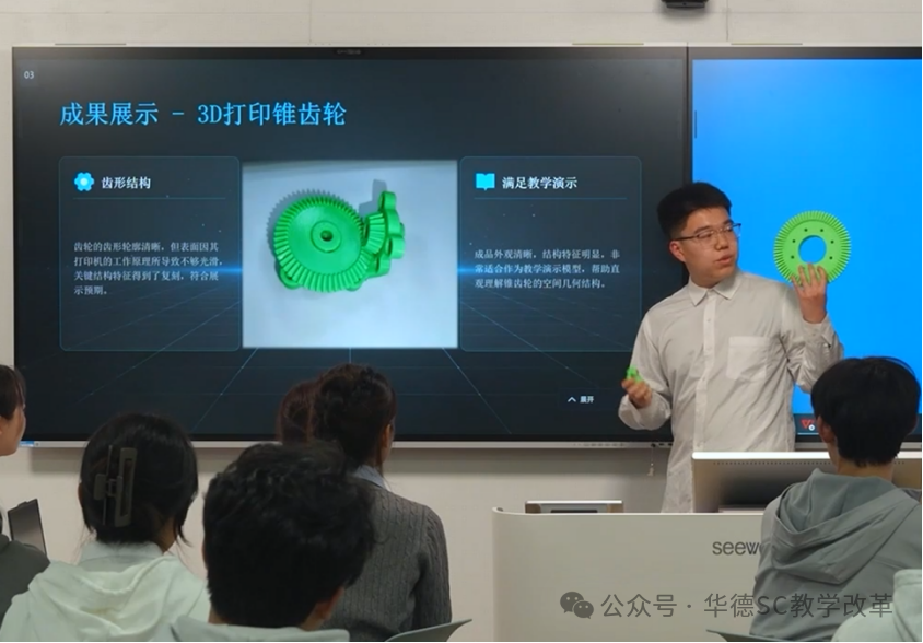 在课堂研讨环节,学生们围绕复杂零件的视图表达、公差标注合理性等专业问题积极发表见解,展开思辨交流。他们依据图纸中的表达方案,讲解汇报机件的空间投影逻辑。在课堂内,加工组的学生将3D打印的实体零件与数字三维模型进行同步展示,借助动态剖切、虚拟装配等技术,使抽象的二维图纸迅速转化为直观的三维结构,成功攻克了空间思维转换这一教学难题。