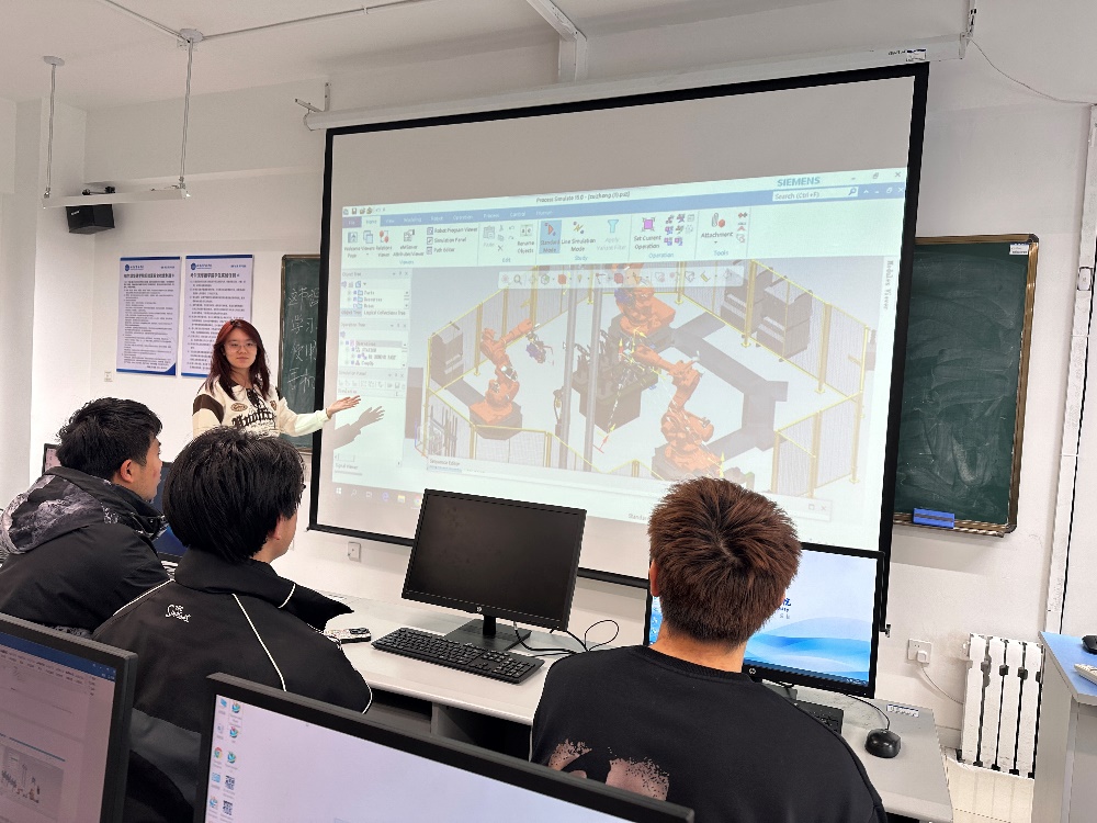 在智能制造工程学院的实训机房里,一场别开生面的数字化工艺仿真实训课正在火热进行。电脑屏幕上,学生们熟练操作Process Simulation(PS)软件,精准完成机器人路径规划、板件焊接仿真、干涉检查等操作;小组围坐在一起,热烈讨论着路径优化方案,有人负责组件定义,有人调试运动学参数,有人记录实训要点。一旁的教师不再是课堂的“主角”,而是穿梭在各组之间,耐心解答疑问、引导学生自主探究。这正是《数字化工艺仿真实训》课程深化SC(Student-Centered,以学生为中心)教学改革后,呈现出的全新课堂面貌。