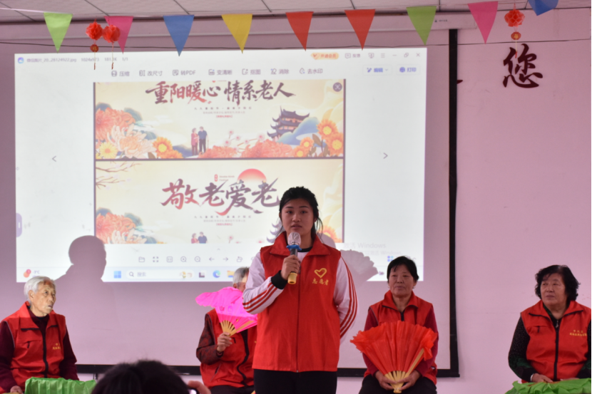 随后,我院志愿者代表陈思棋向在座的长辈致以诚挚的节日问候。她表示,作为年轻一代,不仅要用心聆听长者的智慧箴言,更要用实际行动传递温暖关怀,将把这份敬老爱老的传统美德内化于心、外化于行,在成长道路上不断践行社会主义核心价值观。
