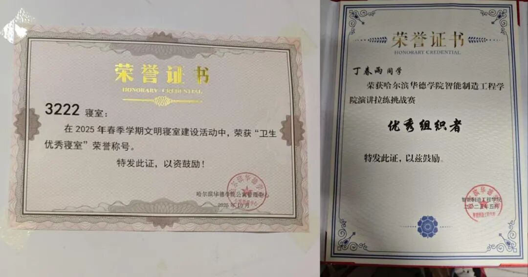 3.综合荣誉类:班级荣获演讲比赛优秀组织奖,3222寝室获评卫生优秀寝室;