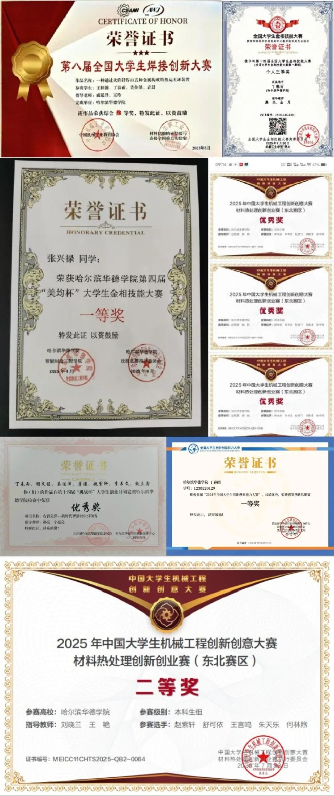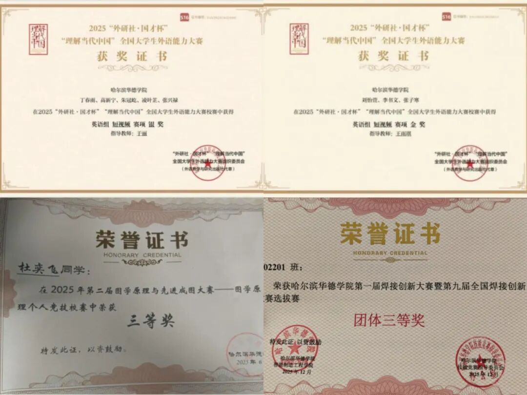 1.科创竞赛类:赵紫轩荣获机械工程创新创意大赛全国三等奖、东北赛区二等奖等多项科创大奖,丁春雨荣获焊接创新大赛国三等奖等实操类奖项;张兴禄获大学生金相技能大赛一等奖。