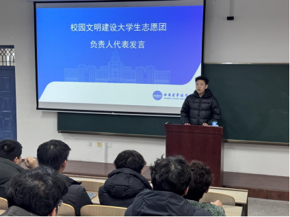 随后,校园文明建设大学生志愿团负责人宁硕对2025年秋季学期工作进行全面总结,充分肯定了全体志愿者在迎新服务、校园禁烟等重点任务中的突出表现与责任担当。他呼吁大家在新的学期继续保持热情、凝心聚力,强化团队协作,以更加饱满的状态投入校园文明建设,再创工作新成效。