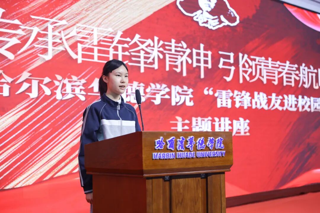 哈尔滨顺迈学校初中部七年级学生李懿慈作为中学生代表发言,她结合自身成长经历,讲述了对雷锋精神的理解与感悟。她表示,要以雷锋同志为榜样,在学习中刻苦钻研,在生活中乐于助人,努力成为新时代好少年,让雷锋精神在青春的土壤中生根发芽。