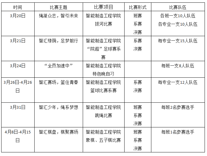 为深入贯彻落实健康学校建设要求,进一步充盈学生课余文化生活,厚植班级向心力与协同合作精神,让运动成为青春最亮丽的底色,让健康为成长筑牢最坚实的根基。智能制造工程学院现面向全院学生组织开展“以智聚力,以动逐光”系列体育活动。具体事项通知如下: