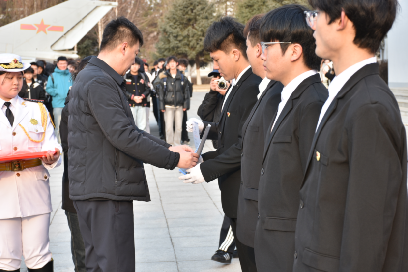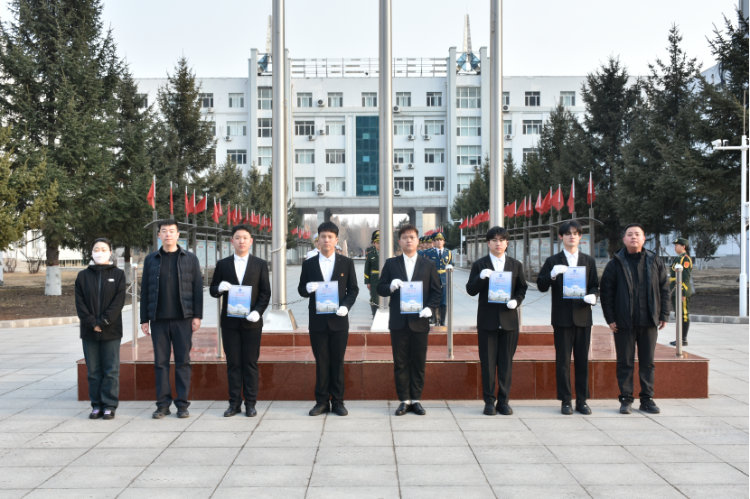 升旗仪式结束后,智能制造工程学院党总支书记、学生发展中心主任郝云松,副主任郑义、杨凯名老师为升旗手颁发“升国旗手资格状。”