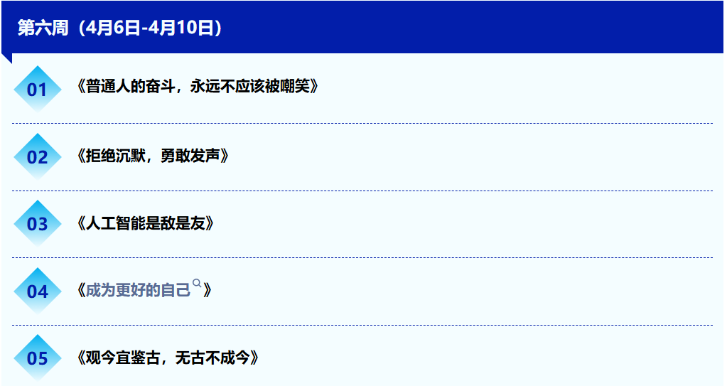 为进一步深化我校校园文化内涵建设,丰富品牌活动载体,持续推进“课前五分钟演讲”活动的有效开展,不断巩固和提升其品牌影响力、思想引领力与实践育人实效,深入贯彻落实《关于深入推进哈尔滨华德学院“课前五分钟演讲”品牌活动方案》,智能制造工程学院依托“课前五分钟”平台,旨在助力广大学子深化专业认知、提升就业竞争力,全面锻炼逻辑思维与沟通表达能力。现将新学期第六周“课前五分钟”演讲主题公布如下: