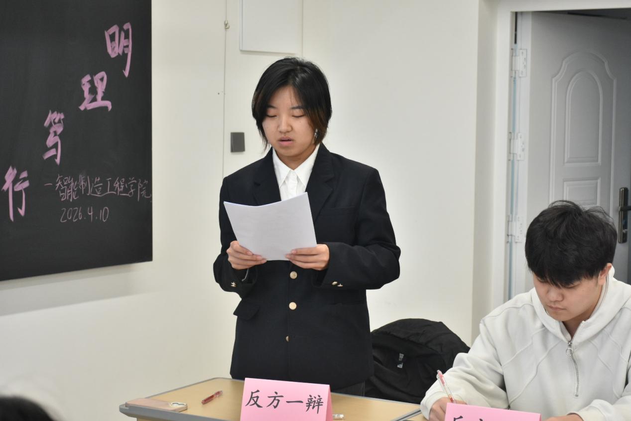 活动现场,正方辩手立论如山,引经据典尽显学识渊薮。辩台之上,或抽丝剥茧,于数据洪流中锚定逻辑支点;或旁征博引,将专业积淀化作铿锵陈词。攻辩之际,妙语如金石掷地,既有工科之严谨缜密,亦不乏人文之温情观照。面对诘问,应答从容,攻守易形间,以智识之光映照真理之路,尽显智能学子知行合一、明辨笃行之风貌。