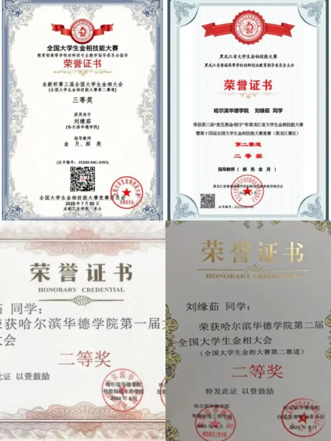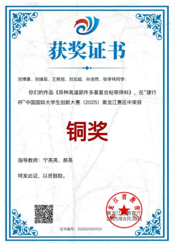 她始终在学业与竞赛中双向发力,把每一次竞赛备赛都当作提升专业能力的契机,在金相技能大赛的赛场反复打磨试样,在应用型人才技能竞赛中锤炼综合实操能力,从校级赛场崭露头角到省级、国家级赛场摘金夺银,先后斩获第三届“麦克奥迪·恒宇”杯黑龙江省大学生金相大会二等奖、“永新杯”第三届全国大学生金相大会三等奖、第十届全国应用型人才综合技能大赛三等奖等佳绩。这份对焊接专业的极致追求,让她在弧光与焊花中淬炼匠心,用扎实的专业积淀斩获国家奖学金,诠释了焊接学子的专业素养与奋进姿态。
