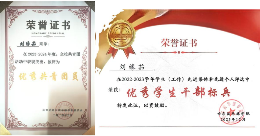 刘缘茹,女,汉族,中共预备党员,2004年3月出生,智能制造工程学院焊接技术与工程专业2202401班学生,现担任班级学习委员,综合测评成绩95.08分。曾荣获2024-2025学年国家奖学金、黑龙江省“三好学生”、校级“优秀学生干部标兵”、校级“先进个人”、校级“优秀共青团员”等荣誉,累计斩获国家级奖项3项、省级奖项3项、校级奖项多项,主持国家级大学生创新创业训练计划项目1项,发表国家级一等奖论文1篇。