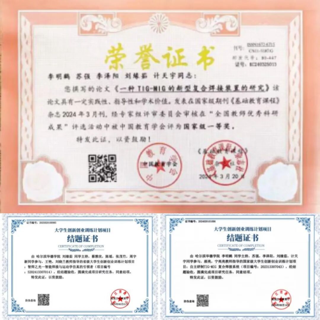 在科研创新的赛道上,她是敢闯敢试的实干者,以竞赛负责人身份牵头参与“互联网+”大学生创新创业大赛,聚焦TIG-MIG复合焊接技术开展研究,带领团队完成《自主研制TIG-MIG复合焊接系统》报告撰写与路演PPT制作,合理分工推进论文材料收集、实验数据记录、实验照片拍摄等工作,全程监督任务落地,最终项目斩获国家级大学生创新创业训练计划项目结题证书,撰写的论文《一种TIG-MIG的新型复合焊接装置的研究》荣获国家级一等奖。
