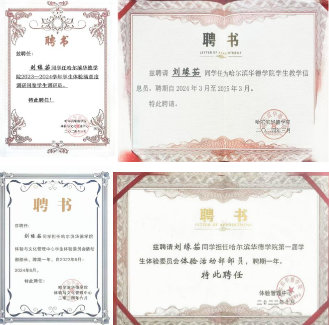 她积极参与各类校园实践活动,在哈尔滨华德学院第十二届田径运动会团体操展演中认真筹备、刻苦训练,获评校级“先进个人”;始终以饱满的热情参与校园各类公益与实践活动,在服务他人、奉献校园的过程中,让青春在实践中绽放光彩,用实际行动诠释省级“三好学生”的责任与担当。