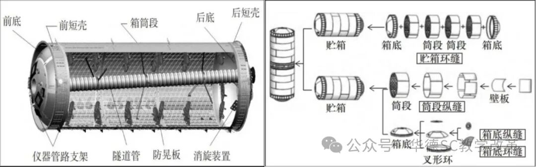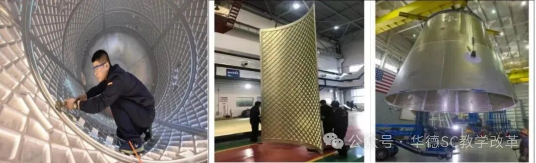 以“长征五号火箭燃料贮箱焊接”为案例,学生分组查阅相关资料,分别从贮箱结构(示意图如图1所示)、运载火箭铝合金贮箱制造过程(如图2所示)、运载火箭贮箱内壁结构(如图3所示)及平面壁板卷弯为圆柱形壁板焊接为贮箱筒段(如图4所示)。在此基础上分析铝合金搅拌摩擦焊的工艺参数(如旋转速度、焊接速度),并通过虚拟仿真软件模拟组织转变过程,最终提出优化方案。该案例覆盖材料选择、热处理、缺陷控制等知识点,使学生理解“焊接质量直接决定航天器寿命”的工程意义。
