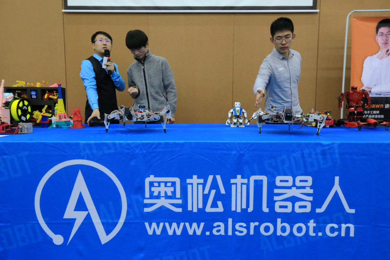 首先,奥松类人双足舞蹈机器人迈着统一的步伐闪亮登场,机械灵活的动作加上律动的节奏,点燃了科普讲座的科技氛围,也燃起了在场学生们的热情。随后,于欣龙董事长携奥松学盟讲师向同学们展示了ZinnoBot智能编程轮式机器人、百变之星创意拼装套件搭建的“6足仿生蜘蛛机器人”、四旋翼无人机飞行器、绘创涂写仪等机器人,并介绍了行业前沿科技动态,通过科普创意产品及最新行情启发同学们的创意想象力,激发了学生对机器人的兴趣。