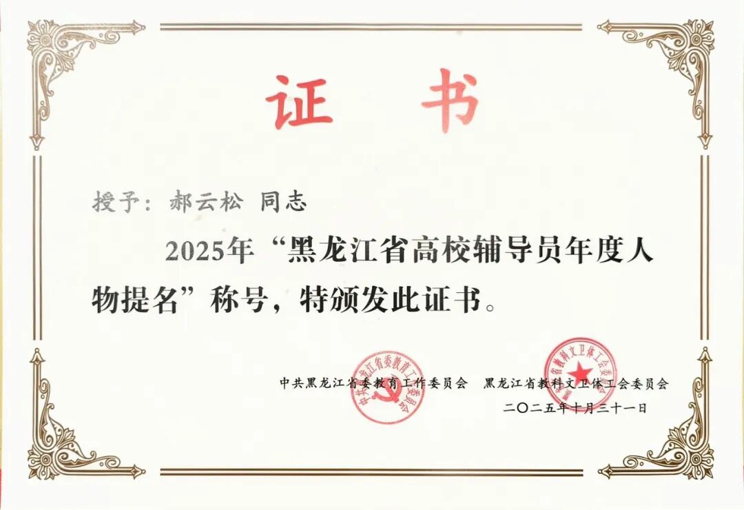 “立德树人·强国有我”2025年“龙江最美高校辅导员”风采展示活动暨黑龙江省高校AI辅导员发布仪式在哈尔滨工业大学举行,我校智能制造工程学院学生发展中心主任郝云松老师荣获“黑龙江省高校辅导员年度人物提名”称号。