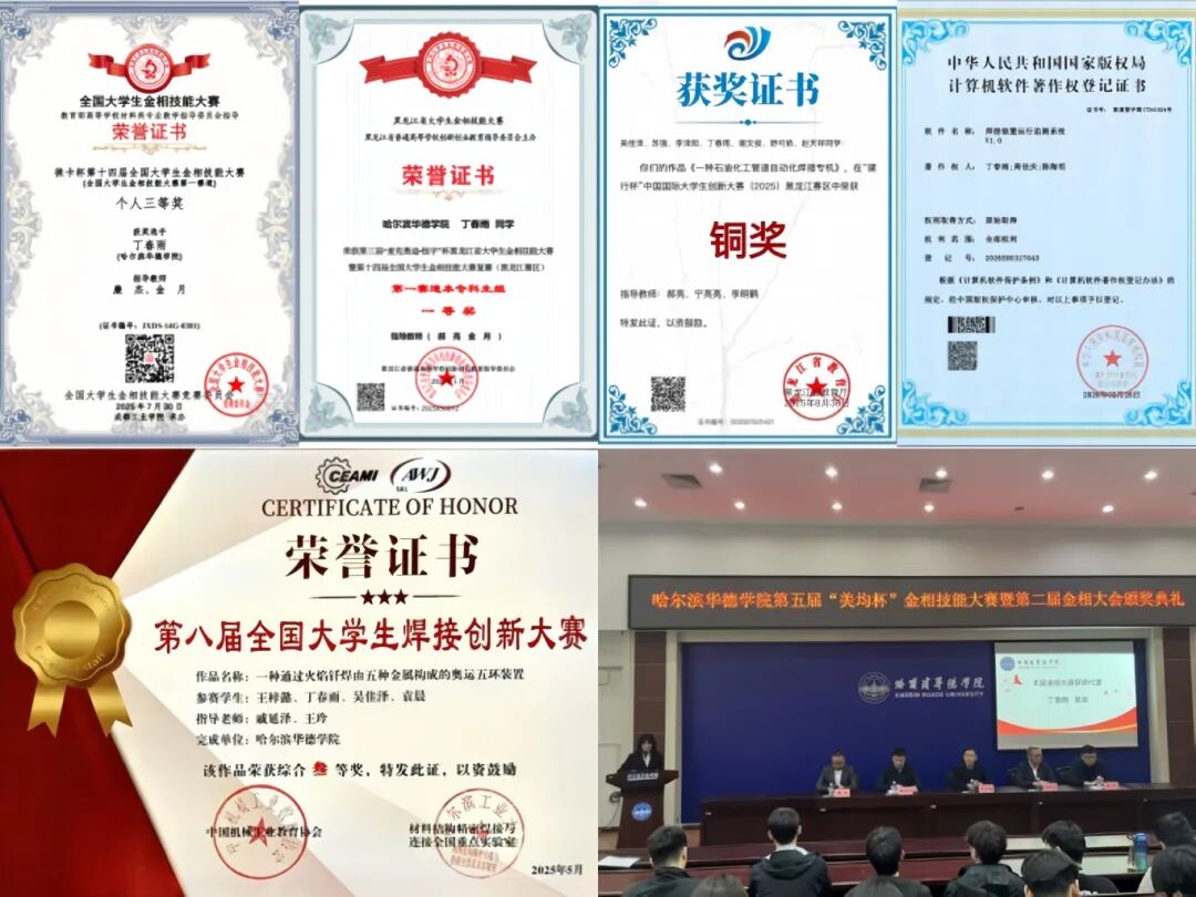 自踏入焊接专业以来,她便始终保持严谨踏实的学习态度,把每一门课程、每一次实训都当作提升自我的契机。课堂上紧跟前沿焊接技术不断夯实理论根基,实验室里则对着试件反复施焊、观察熔池形态、分析焊缝成形,在弧光与焊花的交织中淬炼技艺。她同时在忙碌的学生工作与专业学习之间找到平衡,以高效的时间管理能力兼顾学业与服务,这份自律与坚持,让她连续斩获校级奖学金,更凭借扎实的专业积淀与硬核的项目成果,将国家奖学金收入囊中;并且在各类焊接创新与工程竞赛的赛场上,稳扎稳打、步步突围——从校级赛场崭露头角,到斩获省级一等奖,再奋力冲刺、站上国家级赛事舞台。多张荣誉证书背后,她始终相信“好的焊接工艺,不仅要焊得牢、成型美,更要在服役中传递出工程的可靠与温度”。在专业竞技的赛场,她屡创佳绩:在金相技能大赛中,她备赛时反复打磨金相试样,用扎实功底展现焊接匠心;在另一项赛事中,她深耕MIG/MAG双焊枪技术,反复调试参数、攻克工艺难点,同样斩获国家级奖项,以精准操作诠释专业实力。这份对专业的极致追求,让她的征途,既有深耕技艺的定力,亦有勇攀高峰的锐气。