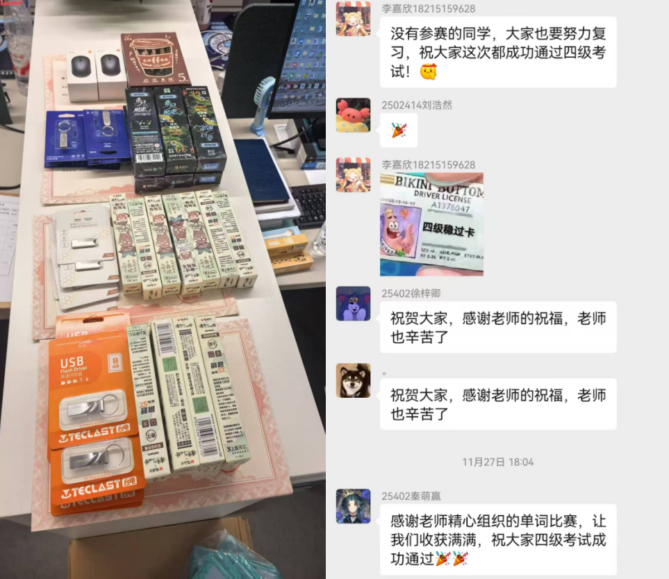 此次活动学生反响较好,班级交流群内,同学们纷纷感谢老师精心组织比赛、还贴心准备了小奖品,主动分享参与收获的同时,也互相鼓励冲刺四级,这份用心进一步激发了系内学生的英语学习热情。此次以赛促学、以赛促练的活动,不仅为学生搭建了展示自我的平台,更有效强化了四级备考氛围,为学生后续学习注入了新动力。