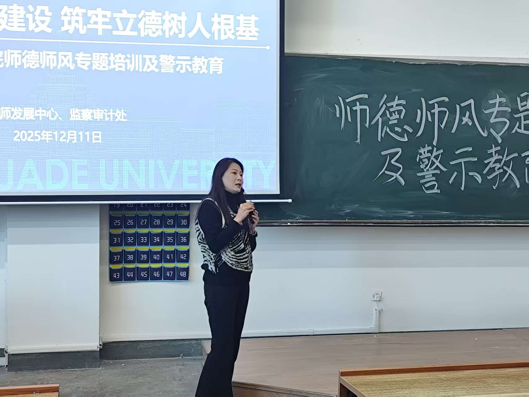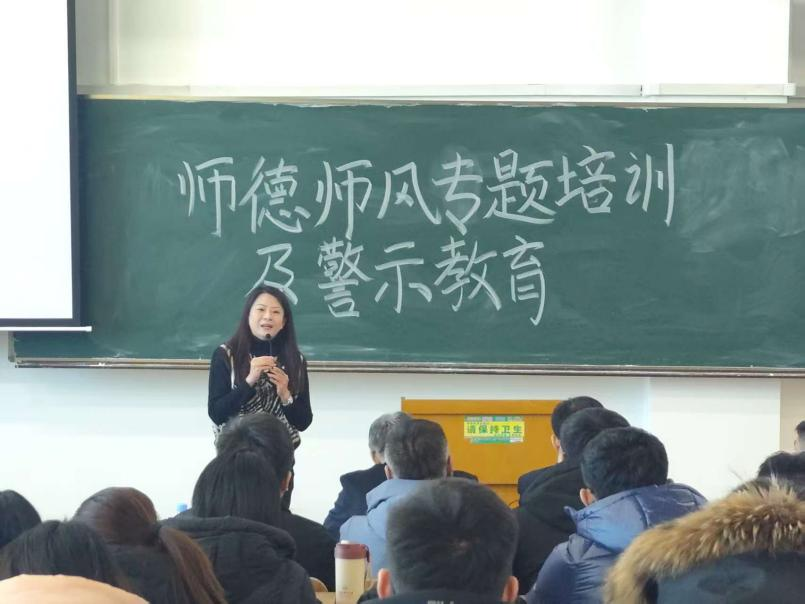 为进一步提高教师的思想政治水平,更好地规范高校教师履职履责行为,加强学院教师团队建设,智能制造工程学院于12月11日组织召开了师德师风专题培训及警示教育会。本次会议由学校副校长张艳、监察审计处处长高瞻主讲,学院全体教职工参会。
