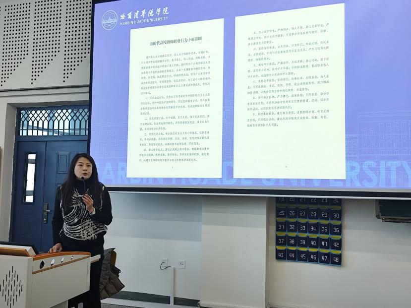学校副校长张艳首先简要地讲解了本次专题培训的核心主旨,强化师德师风建设,筑牢立德树人根基,并带领参会教职工对《新时代高校教师职业行为十项准则》进行深入学习,重点对思想政治表现、教书育人职责、为人师表规范等多个维度进行细致解读。随后通过剖析师德师风先进亮点与个人事迹及育人成效,来强调全体教师务必严守教风底线,在课堂教学、科研创新、学生指导等各方面严格要求自己,做到知责、明规、守纪。