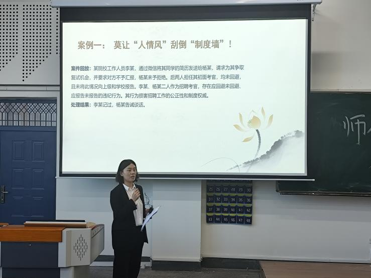 随后,监察审计处处长高瞻向学院全体教职工通报了近期发生的师德失范警示教育案例,并一一进行了深入剖析。她强调,全体教职工要以案为镜、以案促改,坚决守住为人师表的道德底线,持续加强理论学习,牢牢把握政治方向,把教书育人职责做好做实。同时要以典型案例为戒,切实增强纪律意识、规矩意识和法治意识,以高尚的师德情操引领学生成长成才,为学院高质量发展贡献力量。